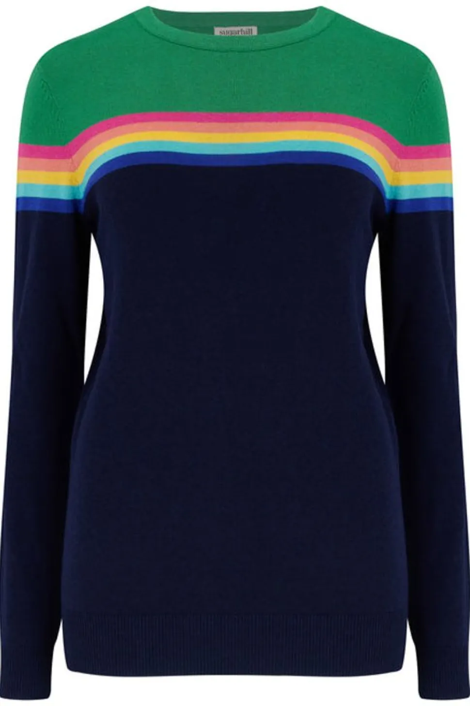 Our Bestselling Semi-Fitted Rita Jumper Shape Has A Lightweight Cotton-Mix Composition, A Crew Neck And Finishes Mid-Hip. Our Range Of Designs Offers An Easy Way To Add Some Fun And Colour To Your Wardrobe. The Rainbow Split Design Is Vibrant And Retro, With A Rainbow Band Intersecting A Green And Navy Base.