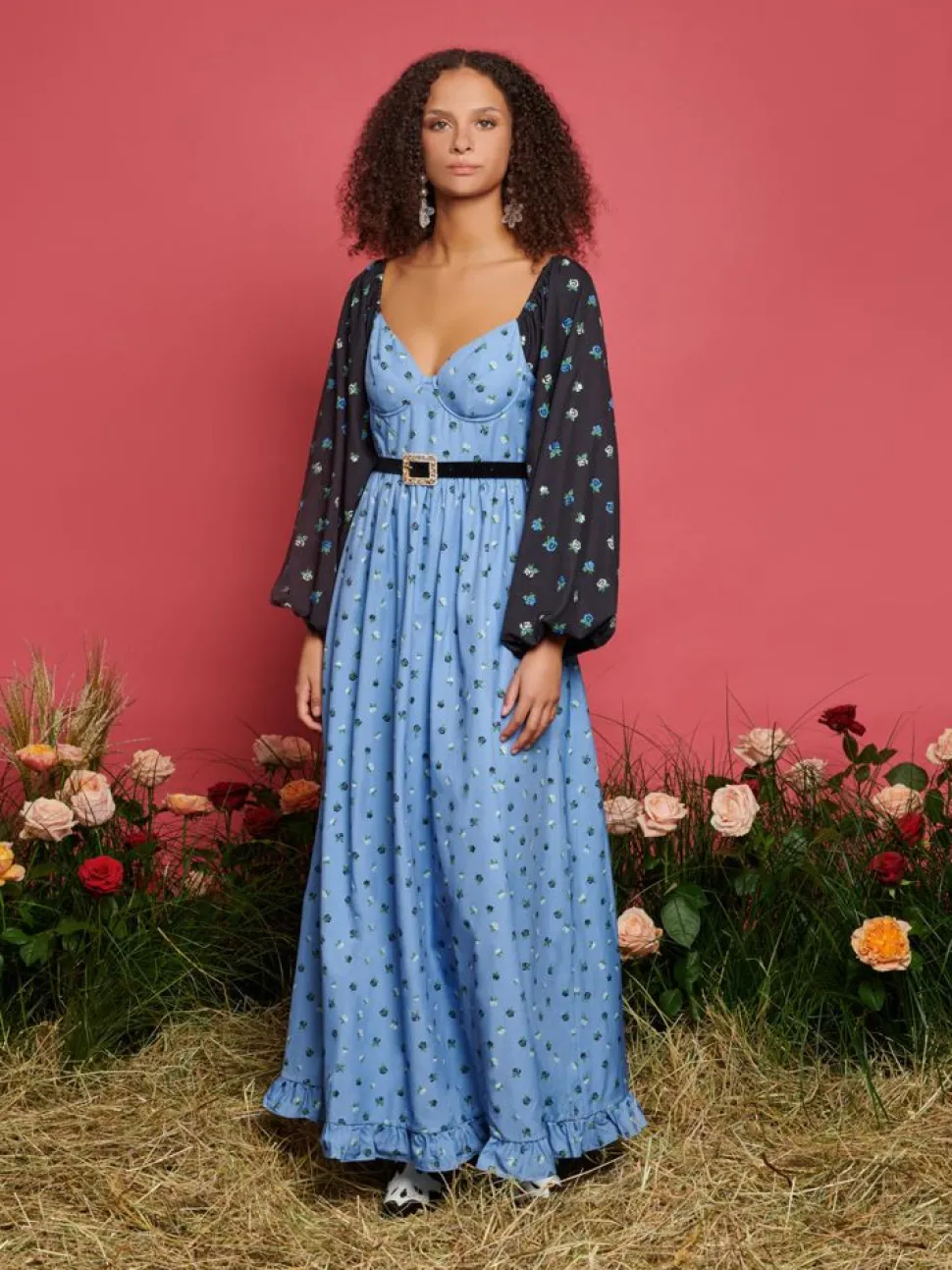 The Pastures Sing Amongst A Scattering Of Sky-Blue And Ditsy Florals. This Mixed-Colour Maxi Dress Is A Two-Tone Silhouette To Be Treasured. Flourish With A Fitted Waist And Flowing Skirt, Fastened With The Rodeo Gem Buckle Belt.