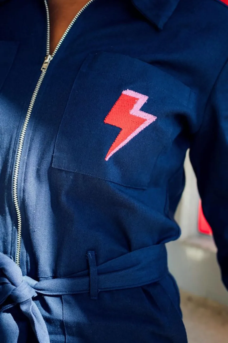 Meet Anwen, Our New Standout, Retro Jumpsuit, Cut With A Tailored Boilersuit Shape. The Deep Navy Anwen Features A Full Sleeve Shirt Upper, An Exposed Front Zip And Straight Legs. The Sharp Shape Has A Seventies Feel, Amplified With The Graphic Lightning Bolt Embroidery On The Bust Pocket.